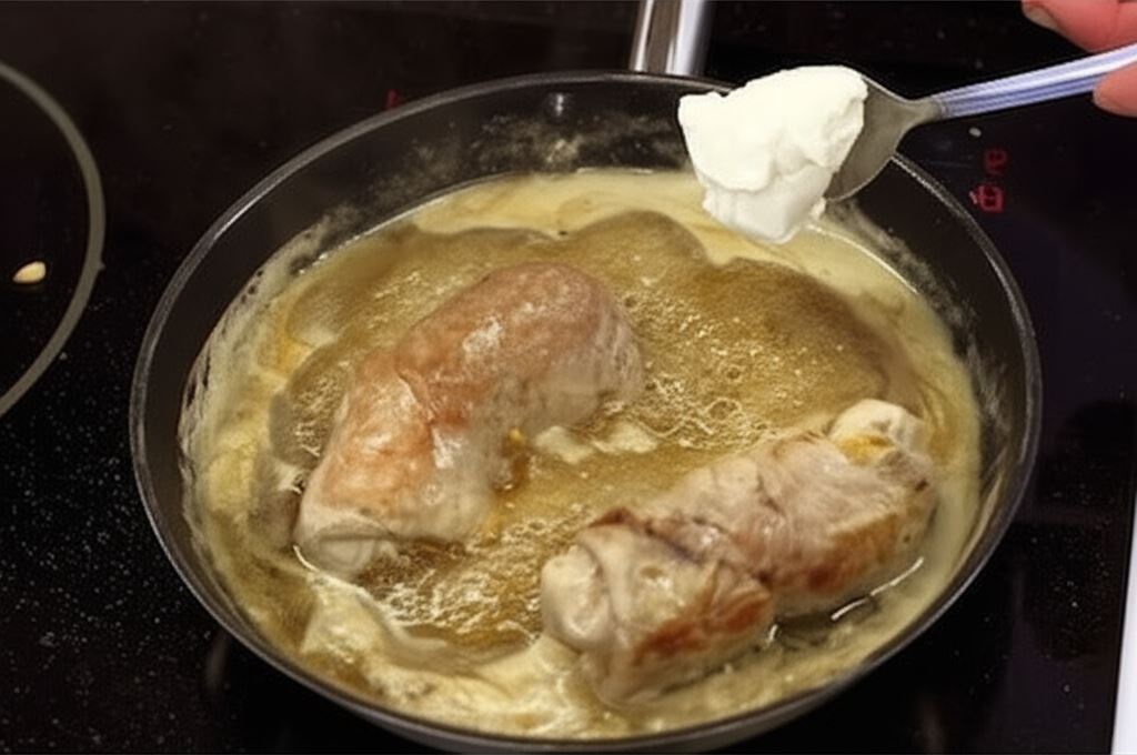 Całość gotuj na małym ogniu przez około 20 minut. Na zakończenie otrzymany sos zapraw śmietaną.