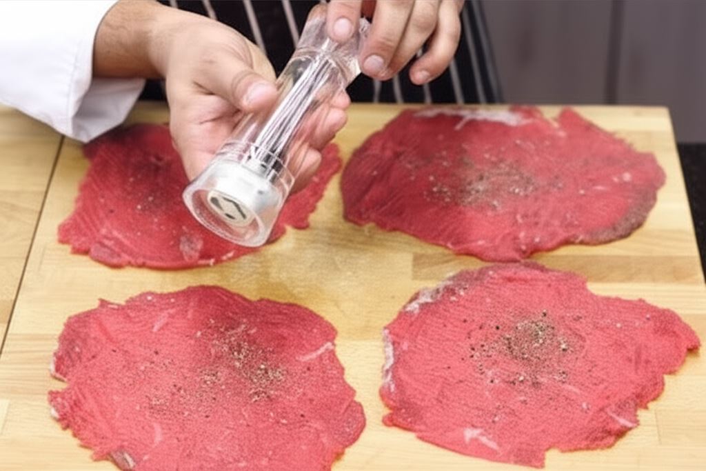 Wołowinę ubij na bardzo cienkie plastry. Przypraw z jednej strony pieprzem.