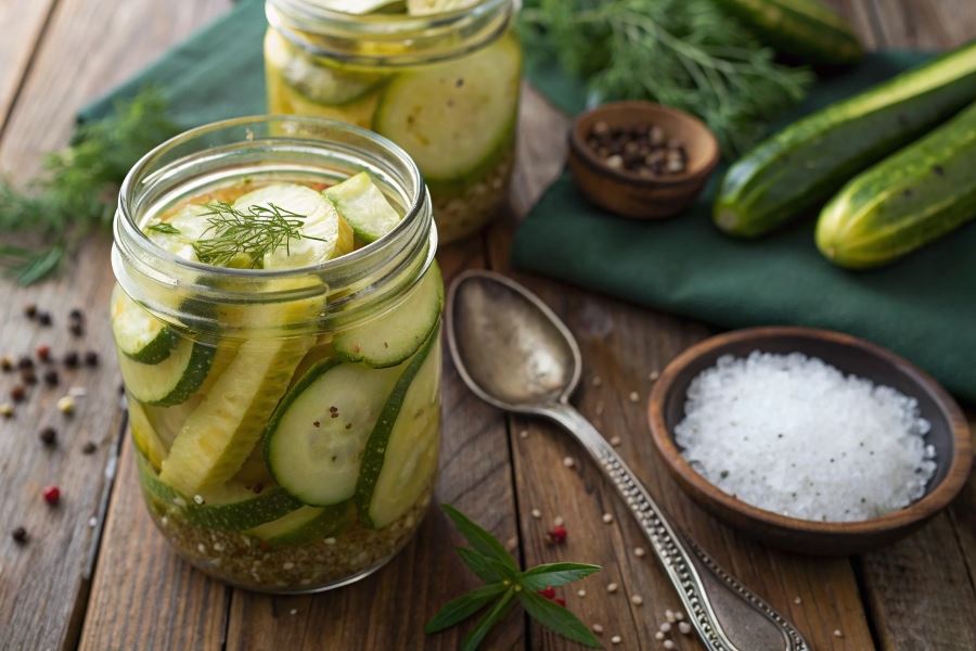 Zalej przygotowaną zalewą (podobną jak przy metodzie tradycyjnej) i zamknij szczelnie. Proces fermentacji trwa krócej – około 3-5 dni w temperaturze pokojowej. Plastry cukinii doskonale absorbują smaki przypraw, tworząc aromatyczną przekąskę idealną jako dodatek do kanapek czy mięs.