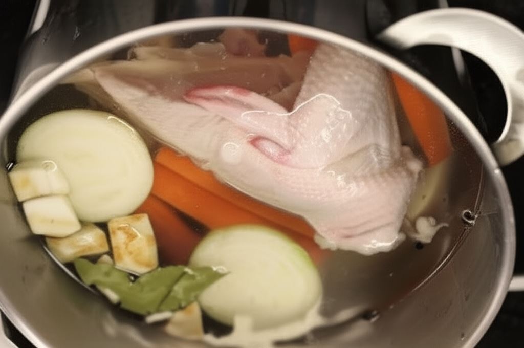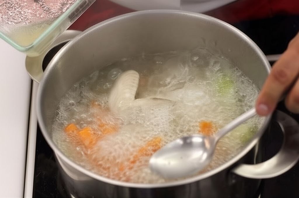 Potem zagotuj, usuń pianę z powierzchni, wsyp przyprawy. Gotuj wszystko przez około 60 minut, aż bulion zyska aromat i smak.