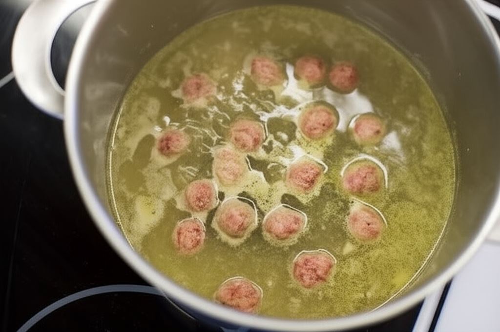Bułkę wyciśnij, połącz starannie z mięsem mielonym, metką, surowym jajkiem i przyprawami. Wymieszaj mięso i kształtuj w małe kulki. Gotuj przez parę minut w pozostałym po brokułach wywarze, wyjmij łyżką cedzakową i odstaw.