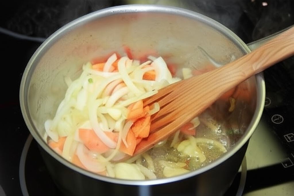 Zetrzyj marchewkę na tarce o grubych oczkach, czosnek drobno posiekaj, cebulę pokrój w piórka. Rozgrzej tłuszcz w garnku, poczekaj moment i dodaj warzywa. Podsmażaj je krótko, potem duś przez około 2 minuty. Wlej 300 mililitrów zimnej wody i gotuj przez 10 minut.