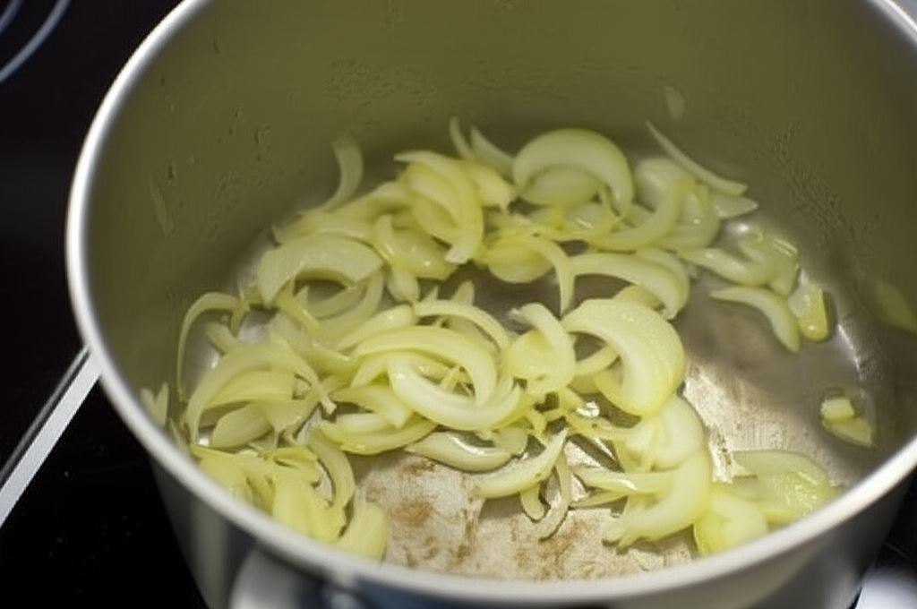 Cebule posiekaj w piórka, 2 ząbki czosnku drobno pokrój. Na tłuszczu zeszklij cebulę, po czym dodaj czosnek.