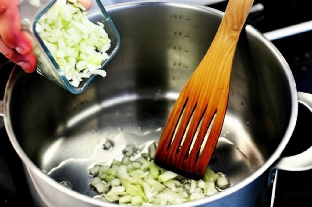 Cebule posiekaj drobno w kostkę i zrumień w garnku na oleju.