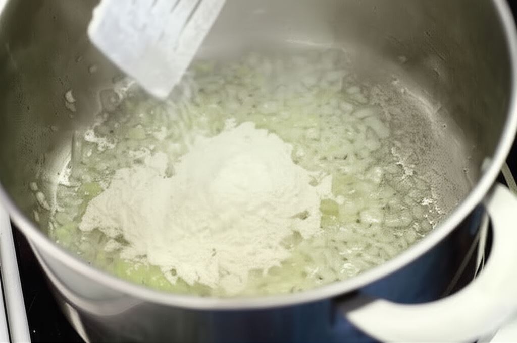 Kiedy cebula stanie się szklista wsyp mąkę i wszystko zasmaż.