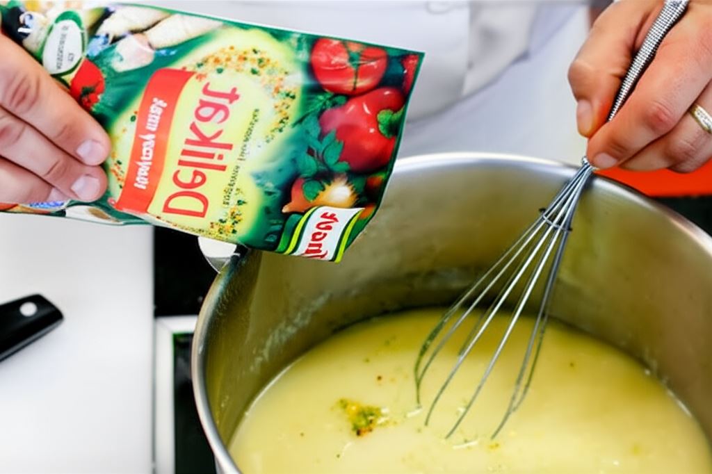 Potem dodaj bulion, wrzuć kiełbasę i przyprawę Knorr. Gotuj wszystko przez około 20 minut. Następnie wyjmij kiełbasę, ostudź ją lekko i pokrój na plastry.