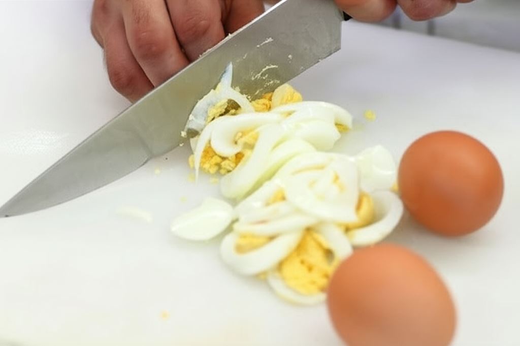 Jajka ugotuj na twardo, potem posiekaj lub zetrzyj na tarce.