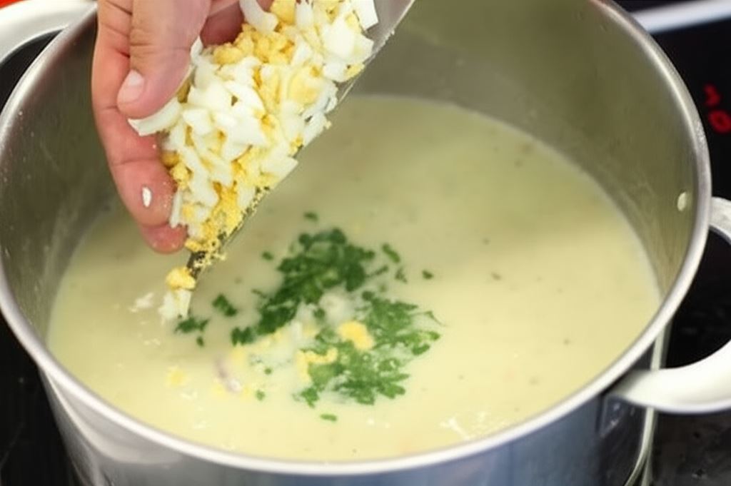 Tuż przed serwowaniem wrzuć do zupy pokrojoną kiełbasę oraz posiekane jajka. Podawaj z natką pietruszki.
