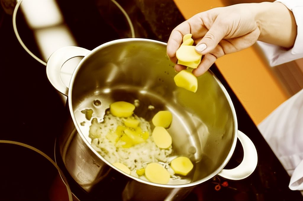Posiekaj pora i cebule w kostkę, zrumień w garnku na oliwie. Potem pokrój ziemniaki, wsyp do reszty i zalej wszystko 1,5 litrem wody.