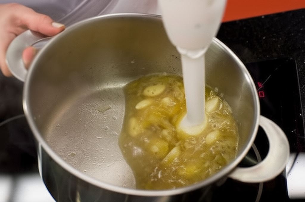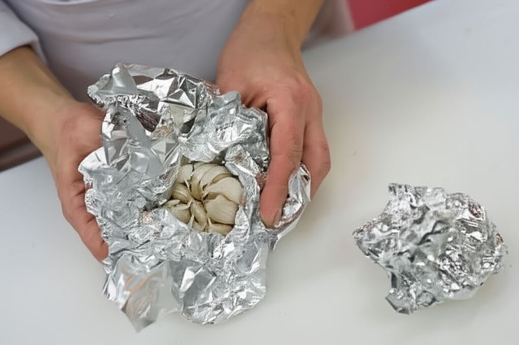 W międzyczasie trzy główki czosnku owiń folią aluminiową i umieść w rozgrzanym do 180 stopni piekarniku na około 15 minut. Po upływie tego czasu wyciągnij czosnek, ostudź, zdejmij łupiny i wprowadź do zupy.