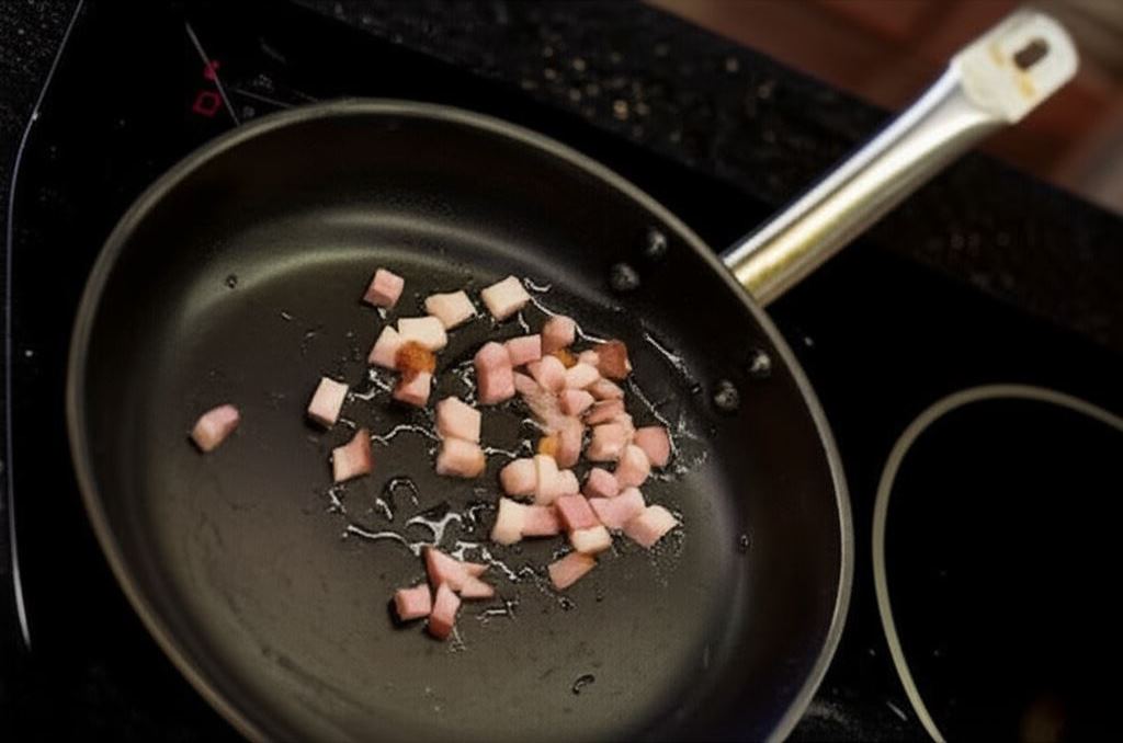 Boczek pokrój w kosteczkę i zrumień na patelni. Odlej nadmiar tłuszczu, skwarki wsyp do zupy. Całość przypraw do smaku majerankiem, zmielonym pieprzem i szczyptą soli (jeśli jest to konieczne).