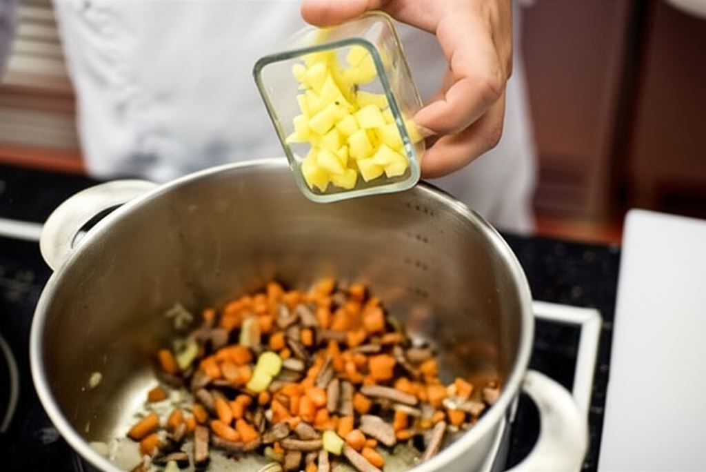 Przyrumień w garnku kiełbasę i cebulę, potem wsyp czosnek, marchewkę oraz ziemniaki.
