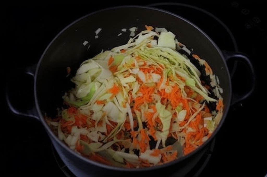 Na rozgrzanej oliwie w garnku zrumień wszystkie warzywa – cebulę, marchew, pora i kapustę. Smaż je do momentu, gdy zaczną się rumienić. Odłóż warzywa na bok.