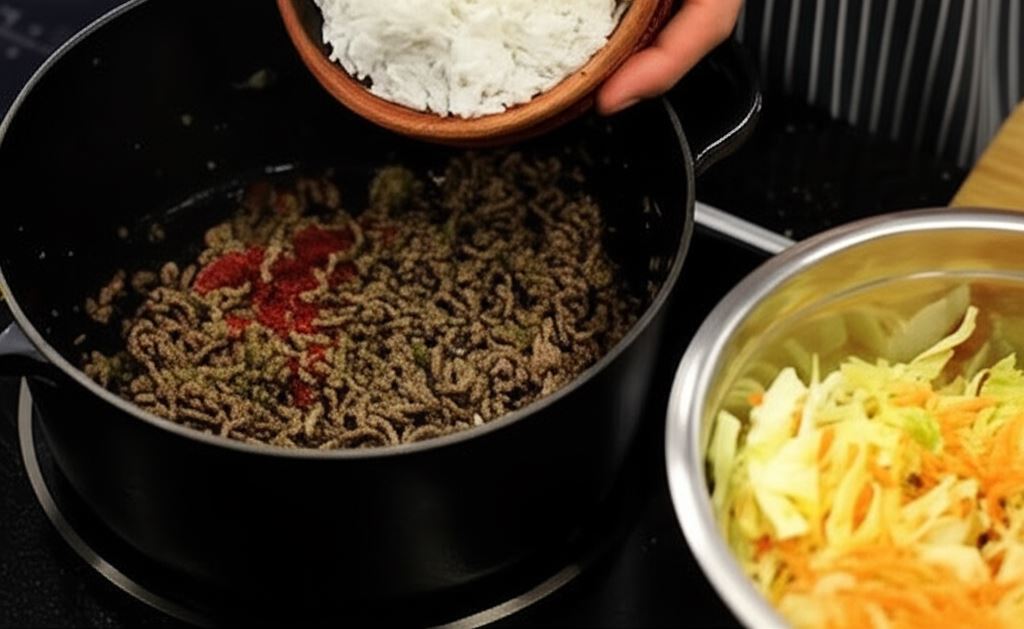 Do garnka wrzuć mięso, smaż dopóki stanie się suche i całkowicie się rozpadnie, następnie dodaj koncentrat pomidorowy i ryż, smaż całość razem przez moment.