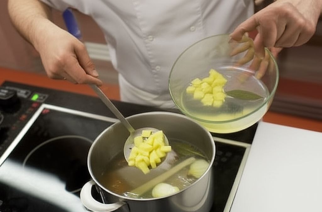 Ziemniaki pokrój w kostkę, wsyp do wywaru i gotuj aż będą miękkie.
