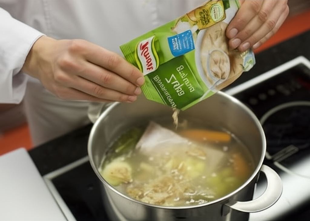 Potem wsyp jedną lub dwie Zupy grzybowe Knorr (zależnie od ilości bulionu), całość dopraw śmietaną.