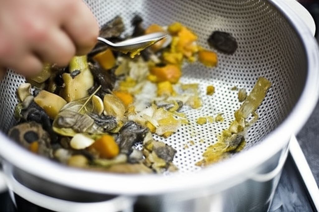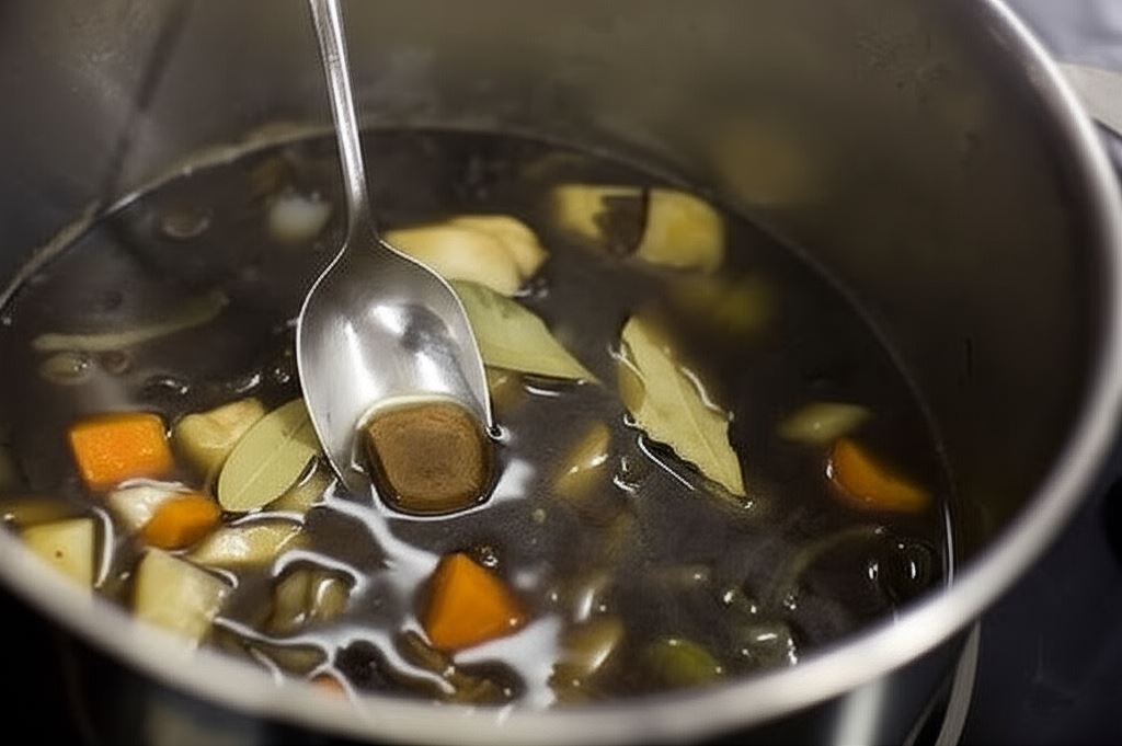 W garnku odpowiedniej wielkości umieść obrane, opłukane i posiekane warzywa, zalej całość 1,5 litrem zimnej wody, wsyp suszone grzyby i zagotuj – usuń zebraną pianę, wsyp przyprawy (ziele angielskie, pieprz, liść laurowy, kostkę bulionu grzybowego).