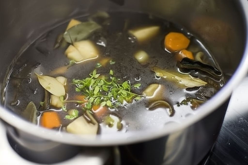 Gotuj na bardzo małym ogniu przez około 50 minut, następnie do zupy wprowadź czosnek i tymianek. Wywar gotuj dodatkowo około 10 minut.