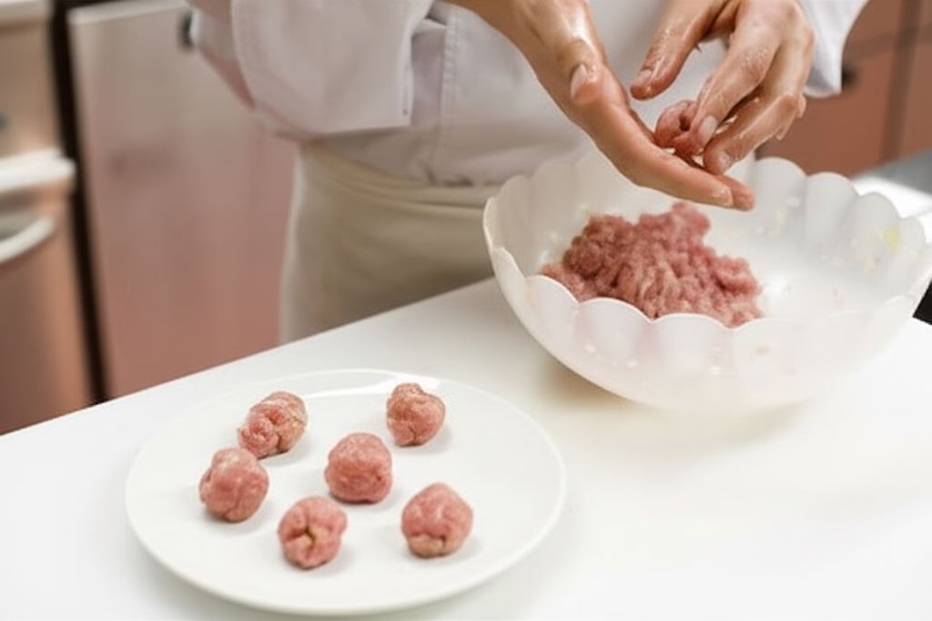 Sporządź mięsne kuleczki: posiekaj cebulę na drobne kawałki, zrumień ją na oliwie (lub oleju) i połącz z mięsem mielonym. Przypraw mieszankę szczyptą czarnego pieprzu, następnie uformuj niewielkie kulki.
