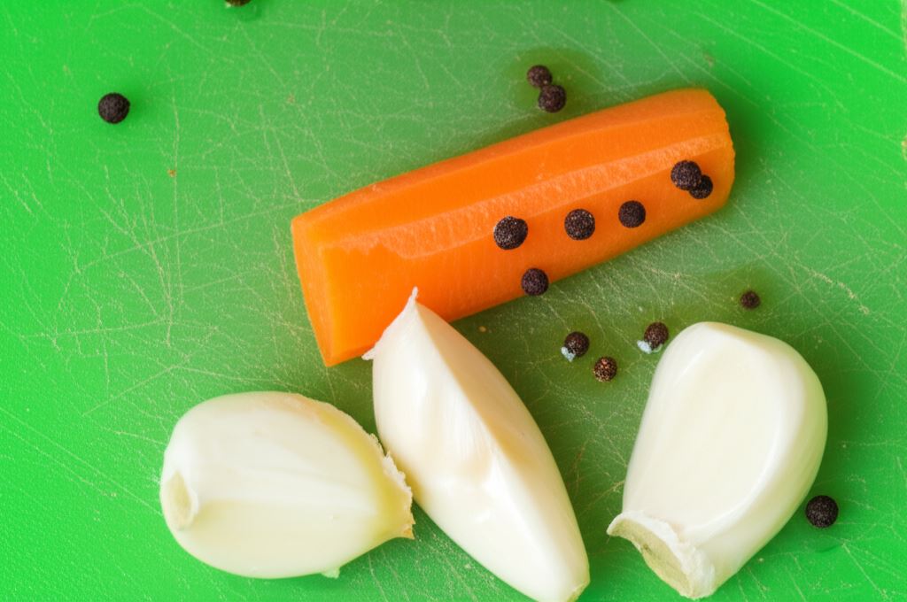 Warzywa opłucz i obierz, wsyp do nich przyprawy i zalej około 1 litrem chłodnej wody. Zmiażdż czosnek i również dodaj do warzyw. Doprowadź wodę z warzywami do wrzenia i gotuj przez około 30 minut, potem zredukuj ogień, aby woda nie kipiała.