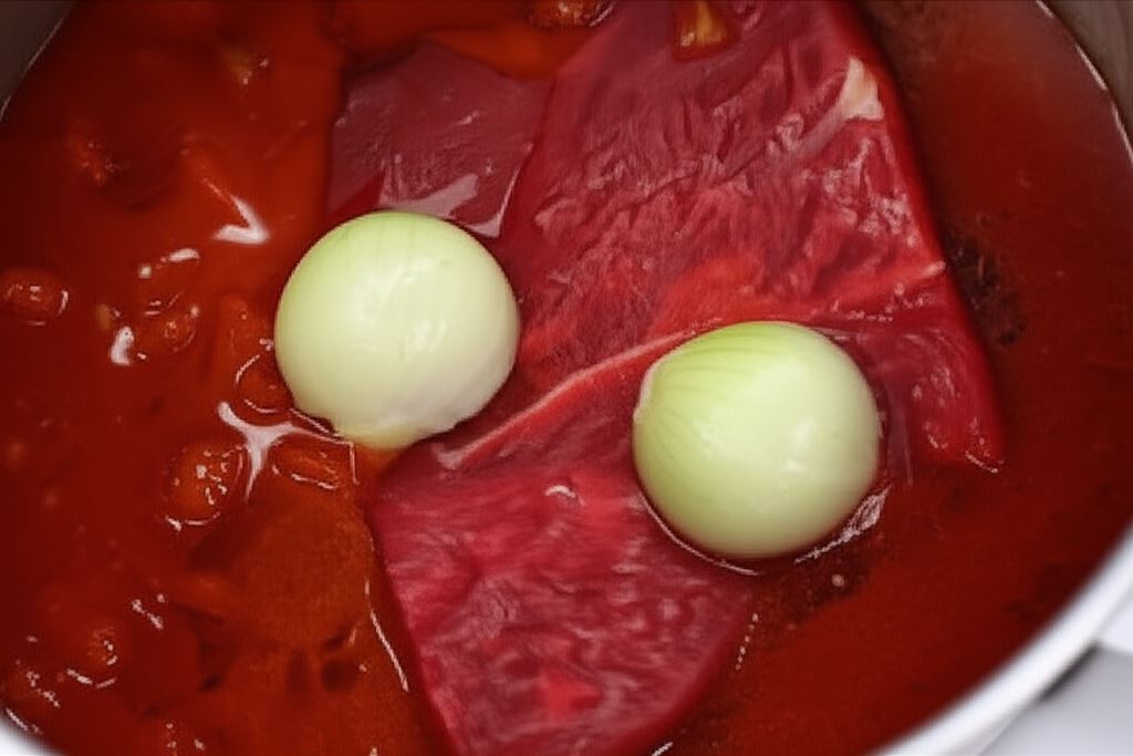 Do garnka wrzuć wołowinę, grubo siekane pomidory z puszki i cebule z wbitymi goździkami. Zalej wodą i przygotuj wywar.