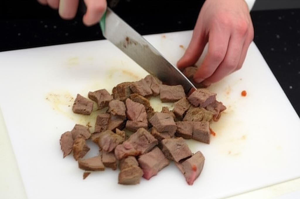 Po około 2 godzinach wyjmij cebule i mięso, a potem je wystudź i pokrój w kostkę.