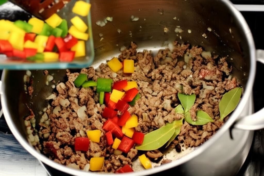 Mięso przysmaż na oleju razem z cebulą i czosnkiem. Dorzuć liść laurowy, ziele angielskie oraz pokrojoną paprykę i pomidorki cherry po pokrojeniu.