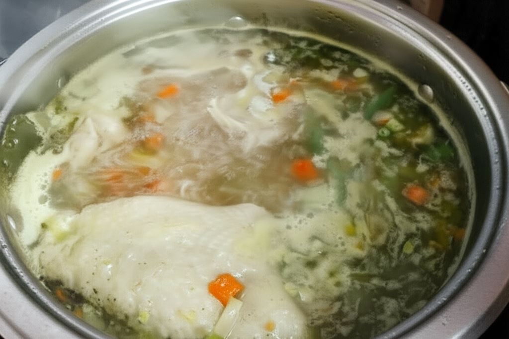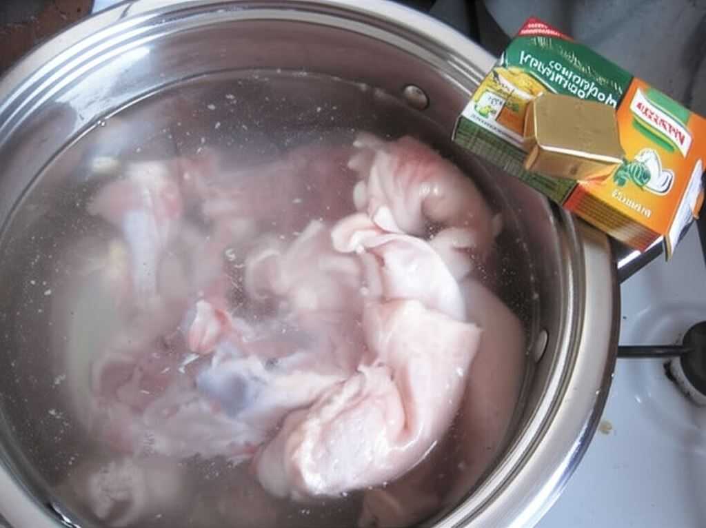 Z kości i skórek pozostałych po luzowaniu udek kurczaka przygotowujemy bulion z dodatkiem kostki warzywnej.