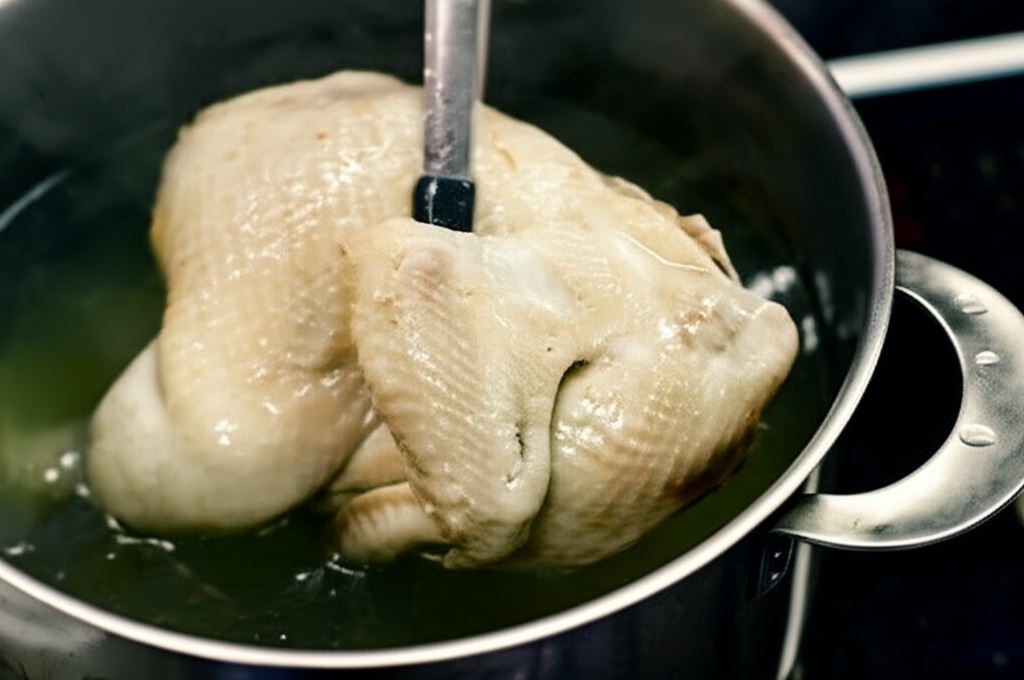Zalej kurczaka wodą i doprowadź do wrzenia. Potem zredukuj ogień i usuń szumowiny.