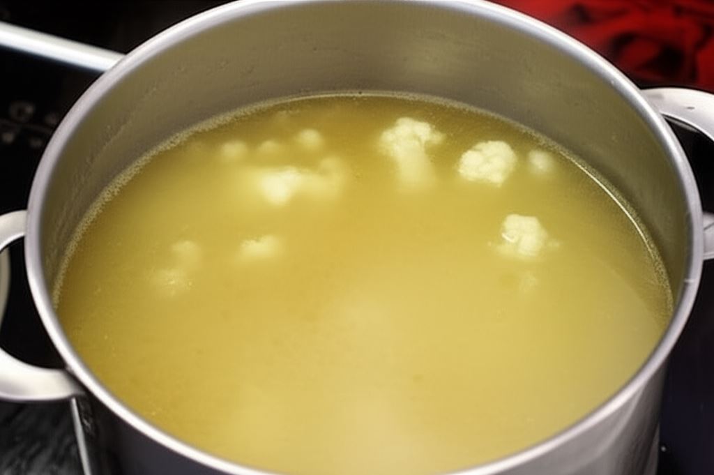 Teraz do klarownego rosołu wsyp ponownie odzyskaną włoszczyznę, jak również różyczki kalafiora i dodaj śmietankę. Wszystko gotuj przez około 15 minut.