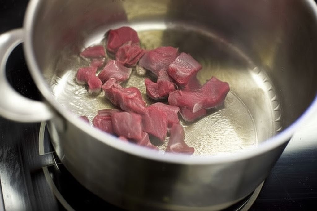 Wlej około litra zimnej wody i zagotuj całość. Usuń pianę, która się utworzy i wsyp przyprawy. Gotuj mięso aż stanie się całkowicie miękkie.