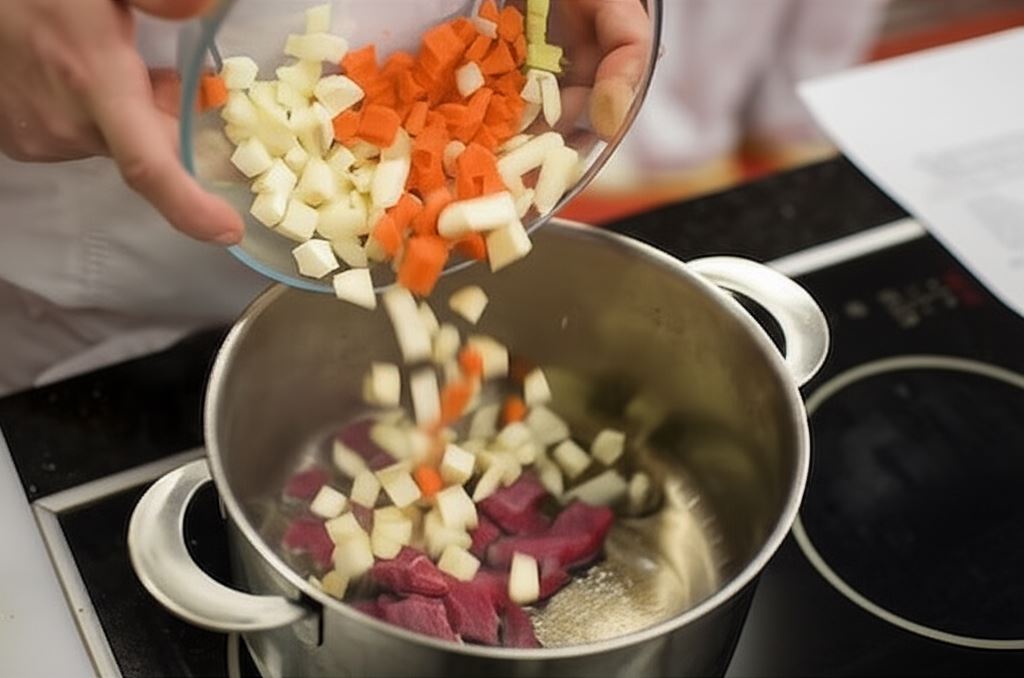 Posiekaj mięso i warzywa w kostkę, a następnie zrumień w garnku na niewielkiej ilości oliwy.