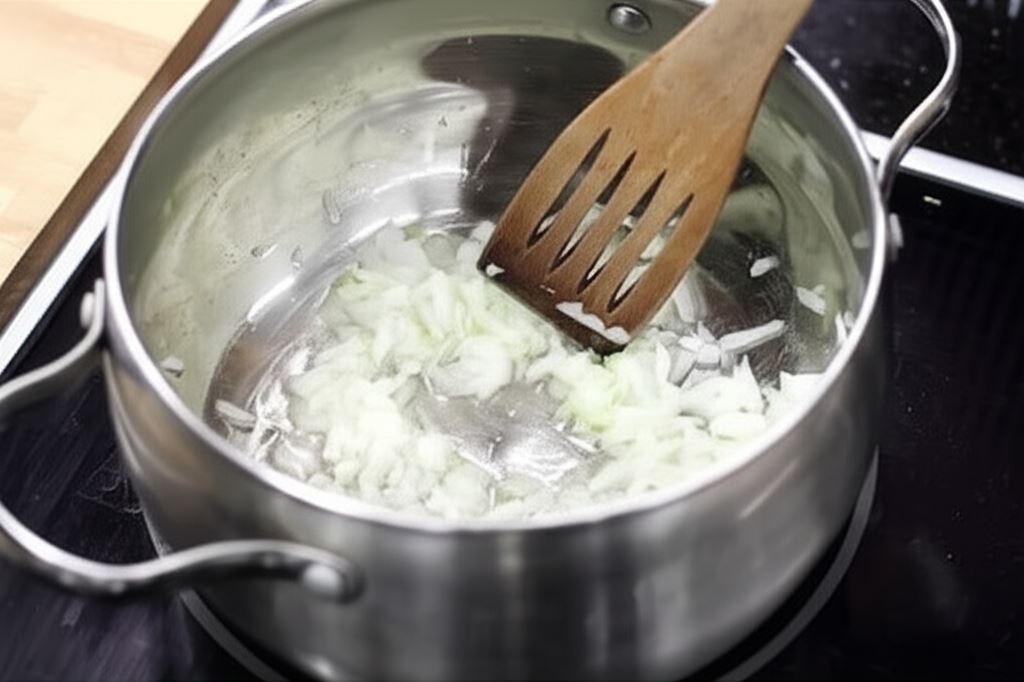 Cebulę posiekaj w kostkę i przesmaż w garnku na rozgrzanej oliwie.