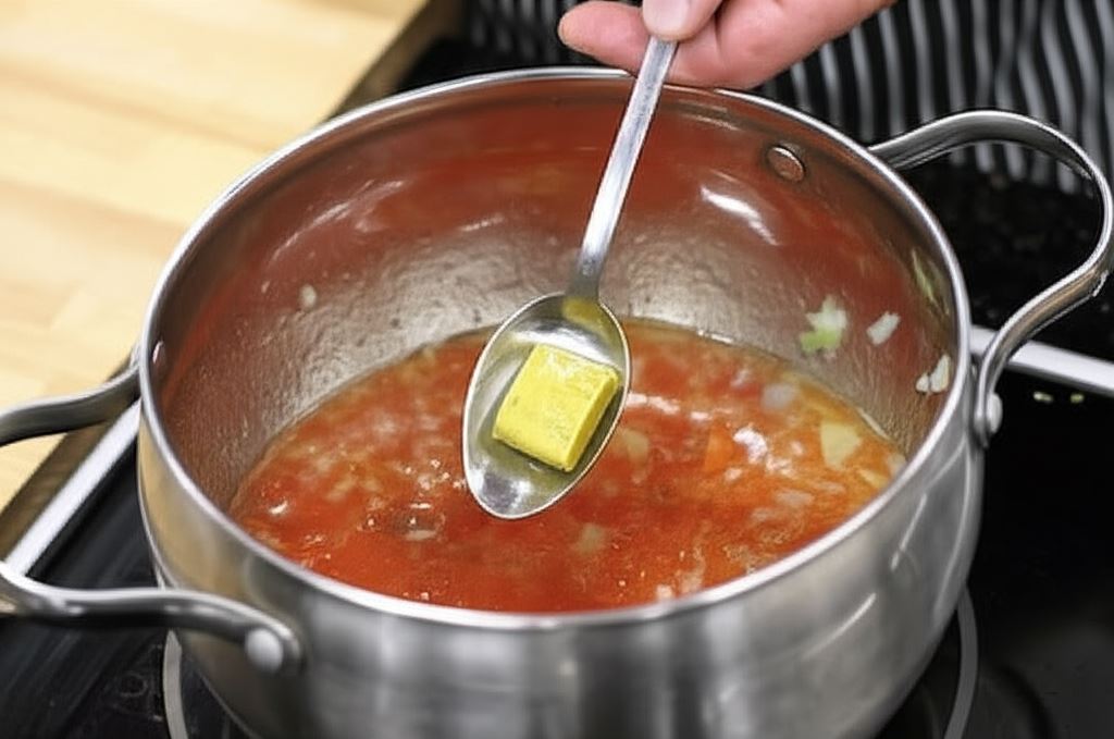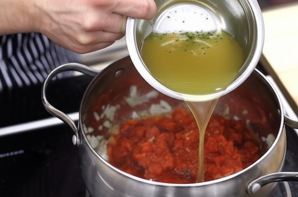 Potem wsyp pomidory z puszki i bulion warzywny. Wszystko doprowadź do wrzenia.