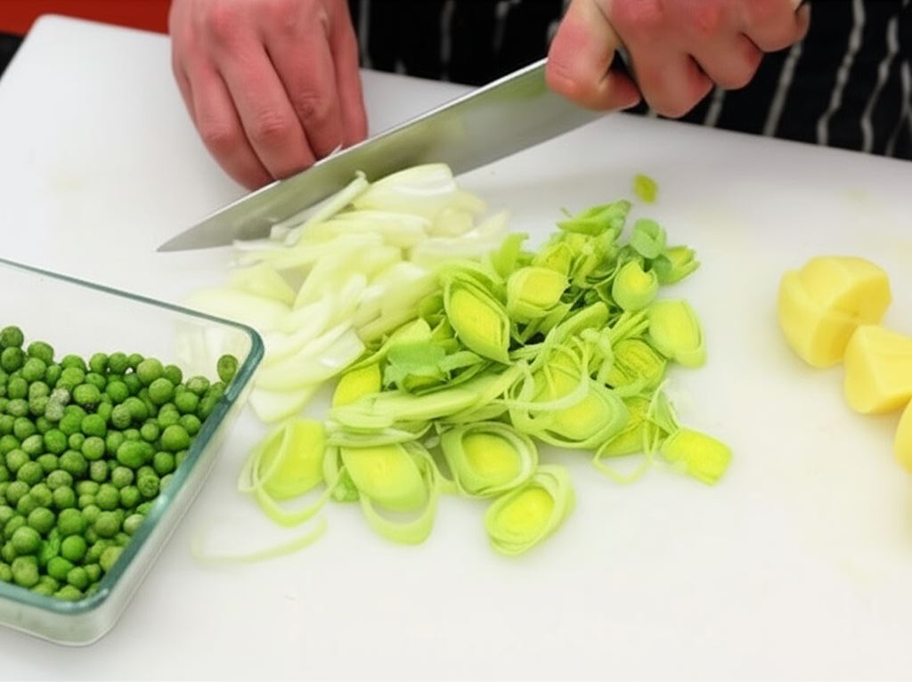 Cebulę posiekaj w piórka. Pora starannie umyj i potnij w paski. Ziemniaki obierz i podziel na cztery części. Groszek odłóż, aby się rozmroził.