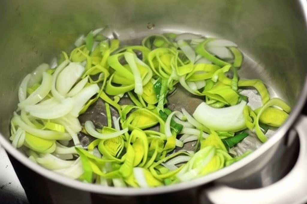 Rozgrzej olej w garnku, wsyp cebulę i pora. Smaż całość do momentu, aż zacznie przybierać rumiany kolor.