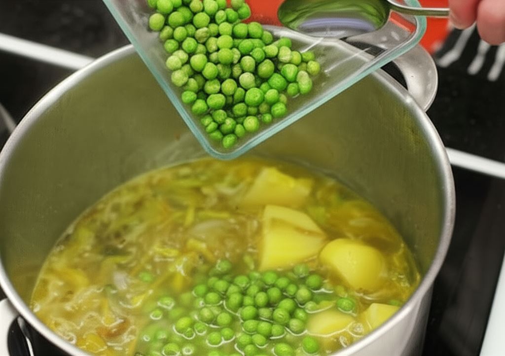 Wsyp odmrożony groszek i gotuj przez następne 5 minut. Groszek powinien być miękki, ale utrzymać swoją zieloną barwę.