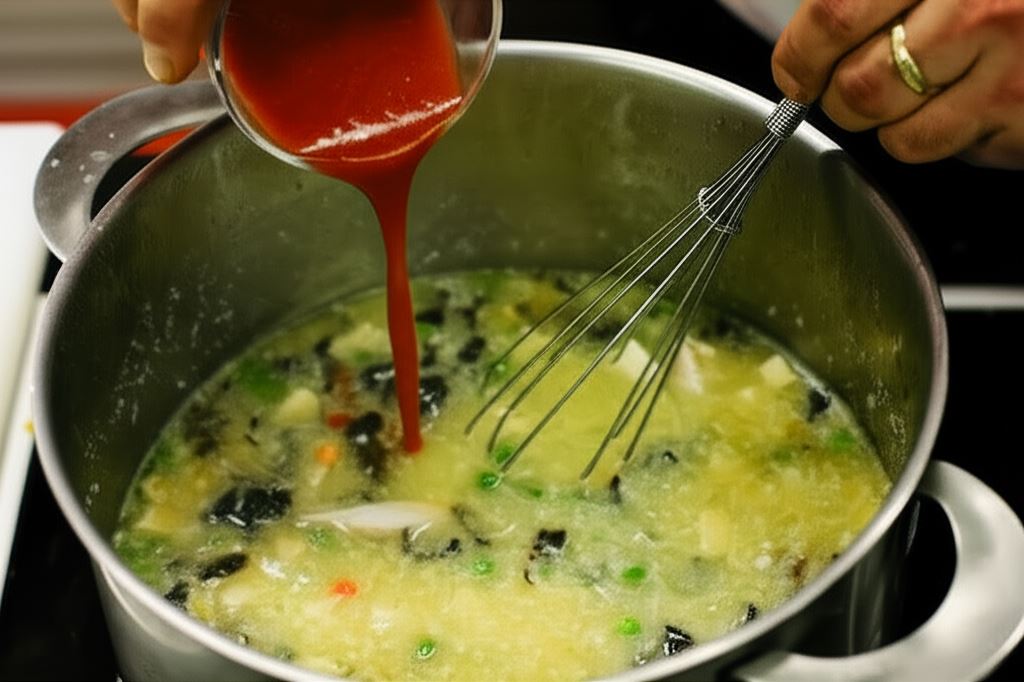 Szukasz alternatywy dla tradycyjnej zupy jarzynowej? Odkryj naszą kwaśno-pikantną zupę chińską, która z każdą łyżką zabierze Cię w kulinarną podróż po Dalekim Wschodzie! Ta aromatyczna kompozycja łączy w sobie delikatność bulionu Knorr z wyrazistymi nutami imbiru i chili, tworząc harmonijną mieszankę smaków. Soczyste kawałki kurczaka, chrupiące pędy bambusa, grzyby mun i tofu pływają w aksamitnym, lekko zagęszczonym wywarze, który nabiera charakteru dzięki dodatkowi octu i soku pomidorowego.