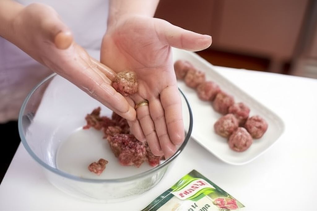 Połącz starannie zmielone mięso z oliwą i szczyptą wszystkich przypraw, następnie uformuj maleńkie kuleczki (około 1 centymetra średnicy).