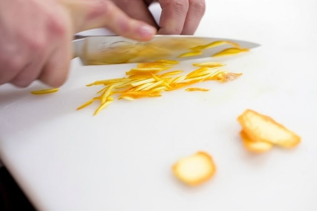 Potnij skórkę pomarańczową w paski, sparz wrzącą wodą na sitku.