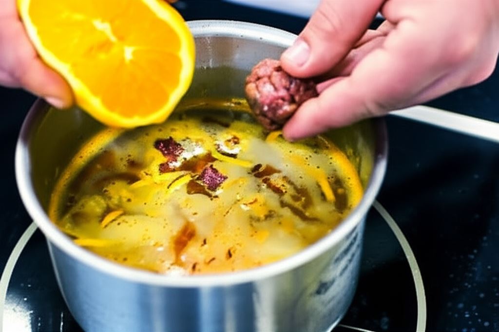 Wrzuć do zupy kulki mięsne, skórkę oraz wyciśnięty sok z połowy pomarańczy. Gotuj wszystko przez około 15 minut, od czasu do czasu mieszając. Na końcu dopraw według smaku, jeśli uznasz to za konieczne. Podawaj zupę na talerzu ozdobionym wokół przyprawami.