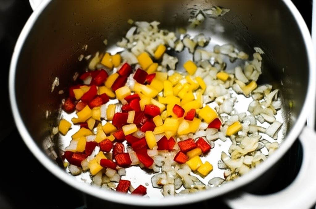 Kiedy czosnek i cebula zrumienią się, wsyp papryki i krótko podsmaż.