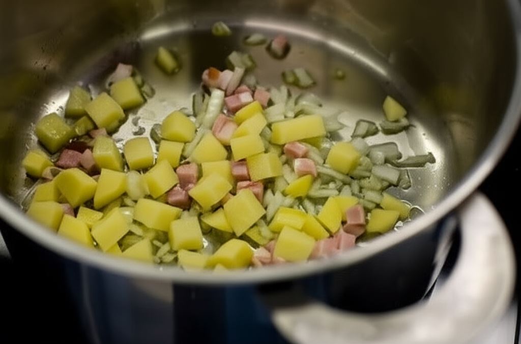 Boczek i cebulę posiekaj w kostkę. Zrumień w garnku. Dorzuć ziemniaki pocięte w kostkę.