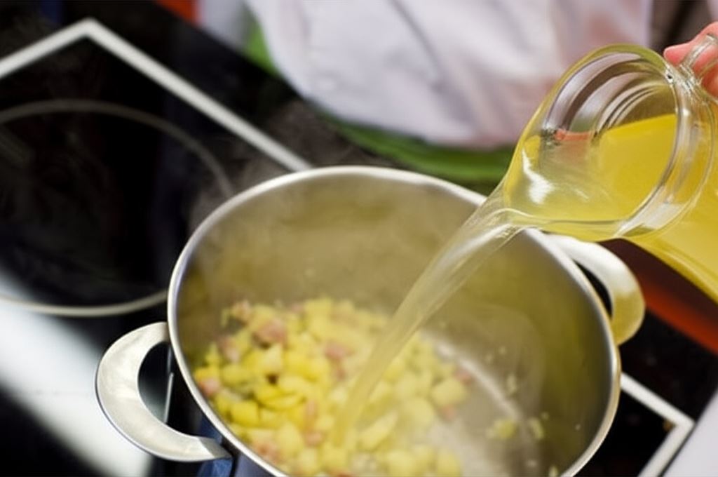 Zalej wszystko przygotowanym bulionem mięsno-warzywnym. Gotuj przez około 30 minut, aż ziemniaki staną się miękkie.
