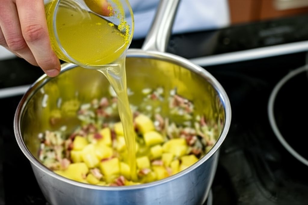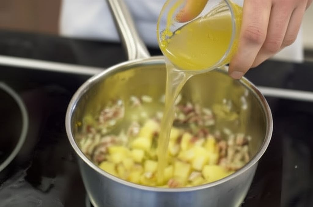 Wszystko zalej przygotowanym bulionem mięsno-warzywnym, gotuj przez około 30 minut, dopóki ziemniaki nie będą miękkie.