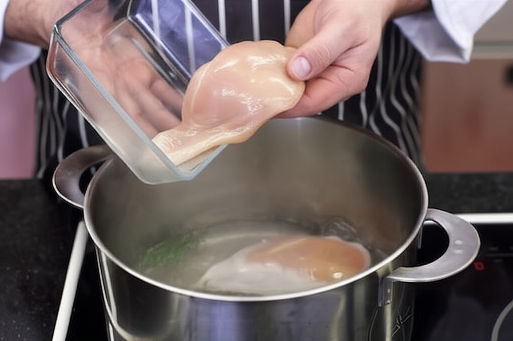 W garnku doprowadź do wrzenia 500 ml delikatnie posolonej wody. Wrzuć świeży tymianek oraz piersi kurczaka. Gotuj na małym ogniu przez około 15 minut.