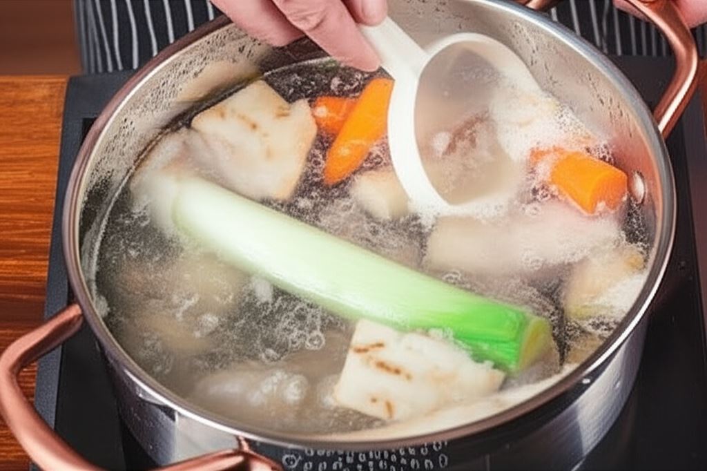 Pokryj część rosołową i warzywa zimną wodą. Zagotuj do wrzenia, zbierz pianę, następnie wsyp przyprawy. Gotuj na wolnym ogniu przez około 1,5 godziny.