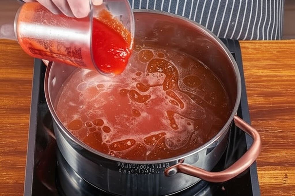 Wyjmij mięso i warzywa. Do uzyskanego wywaru wsyp przecier pomidorowy, po czym zagotuj.