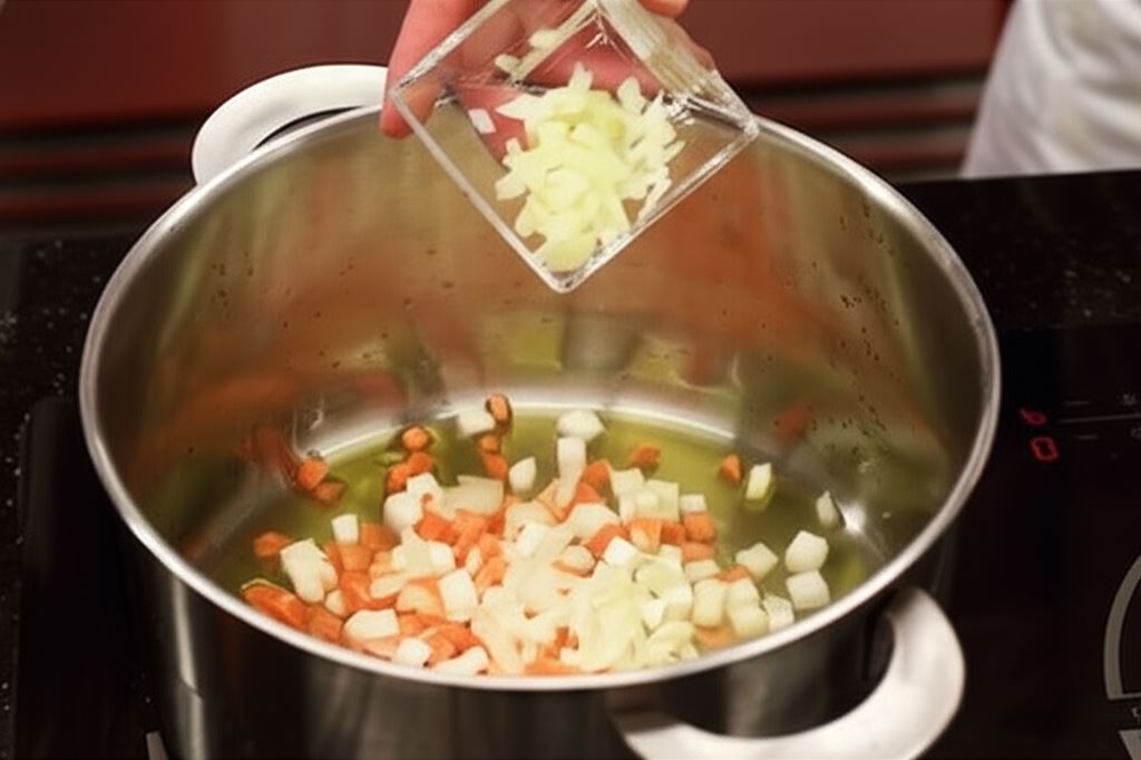 Marchew pokrój w bardzo cienkie paseczki. Przysmaż na patelni, aż stanie się chrupiąca, przenieś na papierowy ręcznik, by odcedzić tłuszcz. Seler, cebulę, koper włoski i marchew podsmaż na oliwie, dolej litr wody.
