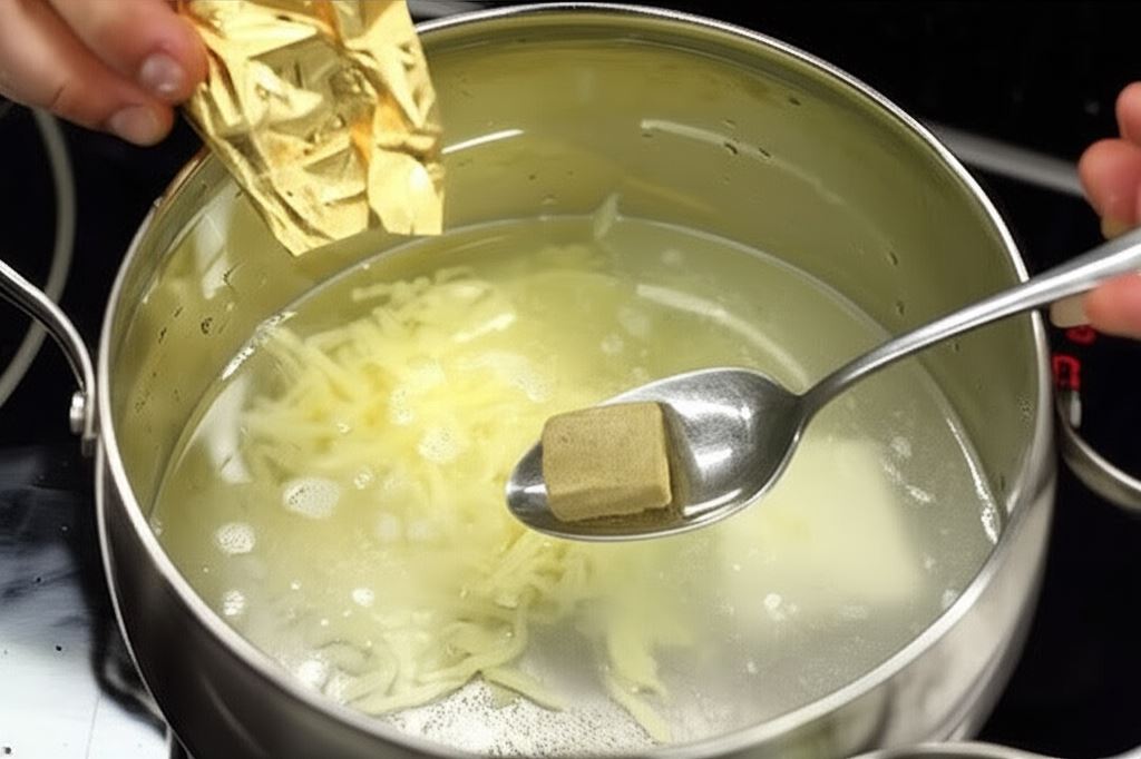 Do wody wsyp kostki Knorr, ser topiony i żółty, gotuj na małym ogniu aż ser się rozpuści.